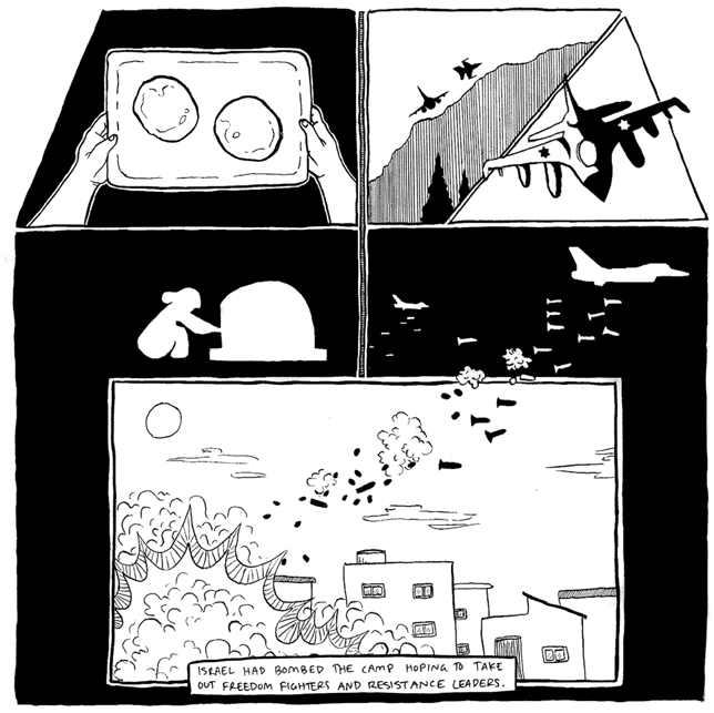 Although these wider geopolitical moments provide important cornerstones for the comic’s narrative, Baddawi repeatedly documents the day-to-day lives of Ahmad and his family to reassert the resilient nature of Palestinian refugees as they carve out a life for themselves in spite of the ongoing violence. Abdelrazaq’s depiction of Palestinians’ everyday life in Beirut and Baddawi thus reframes—quite literally, using the framing technique unique to the comics form—the ongoing existence of domestic life to emphasise the resilience of refugee populations, perhaps best encapsulated in the much-used Palestinian slogan: ‘to exist is to resist’.