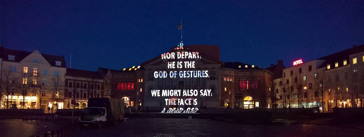 Featured Image: Yousif’s poetry projected onto the Bipertorv Building, Denmark, as part of Jenny Holzer’s installation for the 2017 Capital of Culture (c) J. Holzer