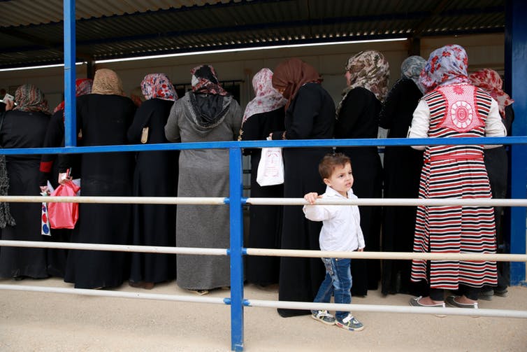 Featured Image: Syrian refugees wait at Zaatari refugee camp in Jordan. Andre Pain/EPA