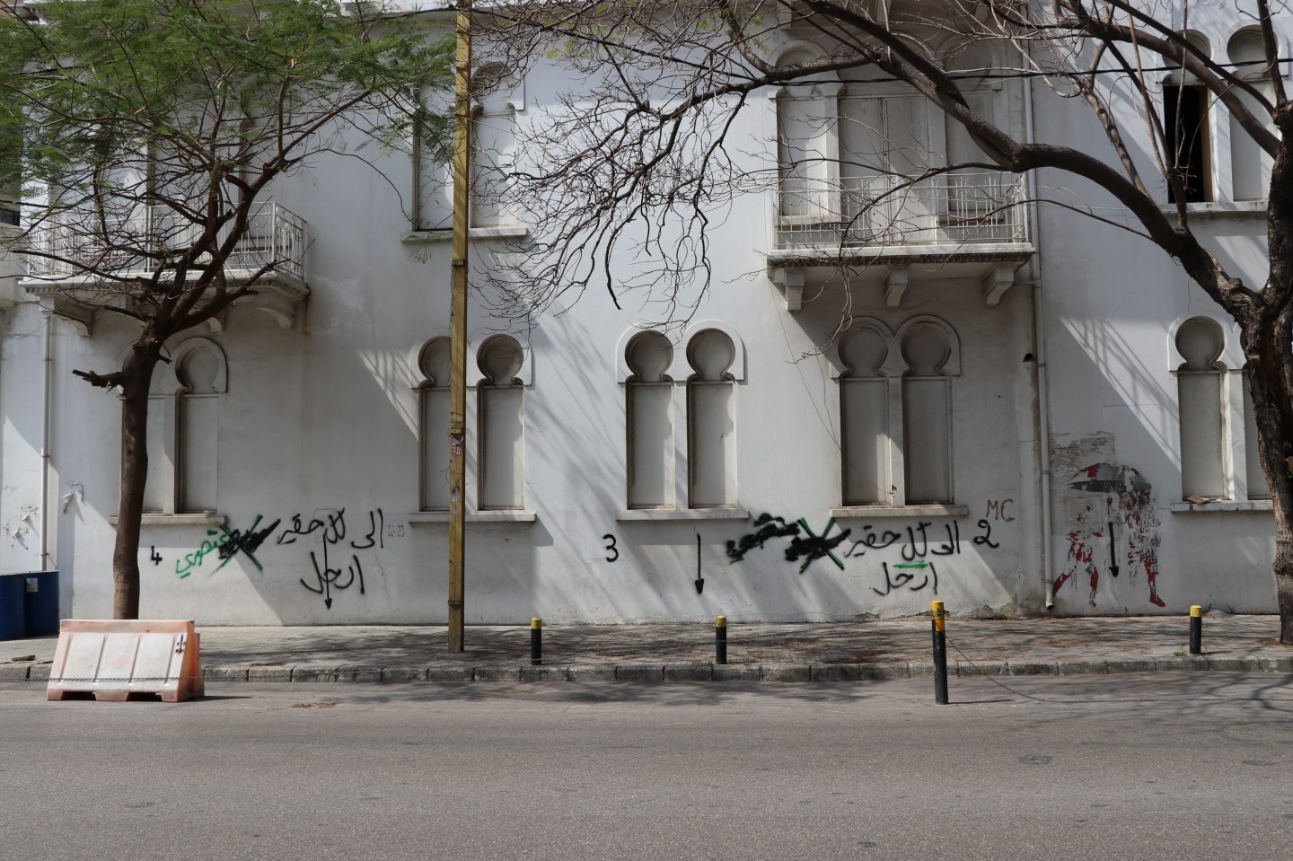 Photograph: Graffiti on the facade of a building in Beirut © Elena Fiddian-Qasmiyeh, Beirut, Lebanon, April 2018.