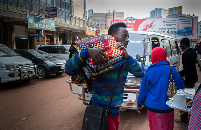 Featured Image: Elvis Lembe, a Congolese fabric trader, transports kitenge to his shop in downtown Kampala (Joel Ongwech, 2017)